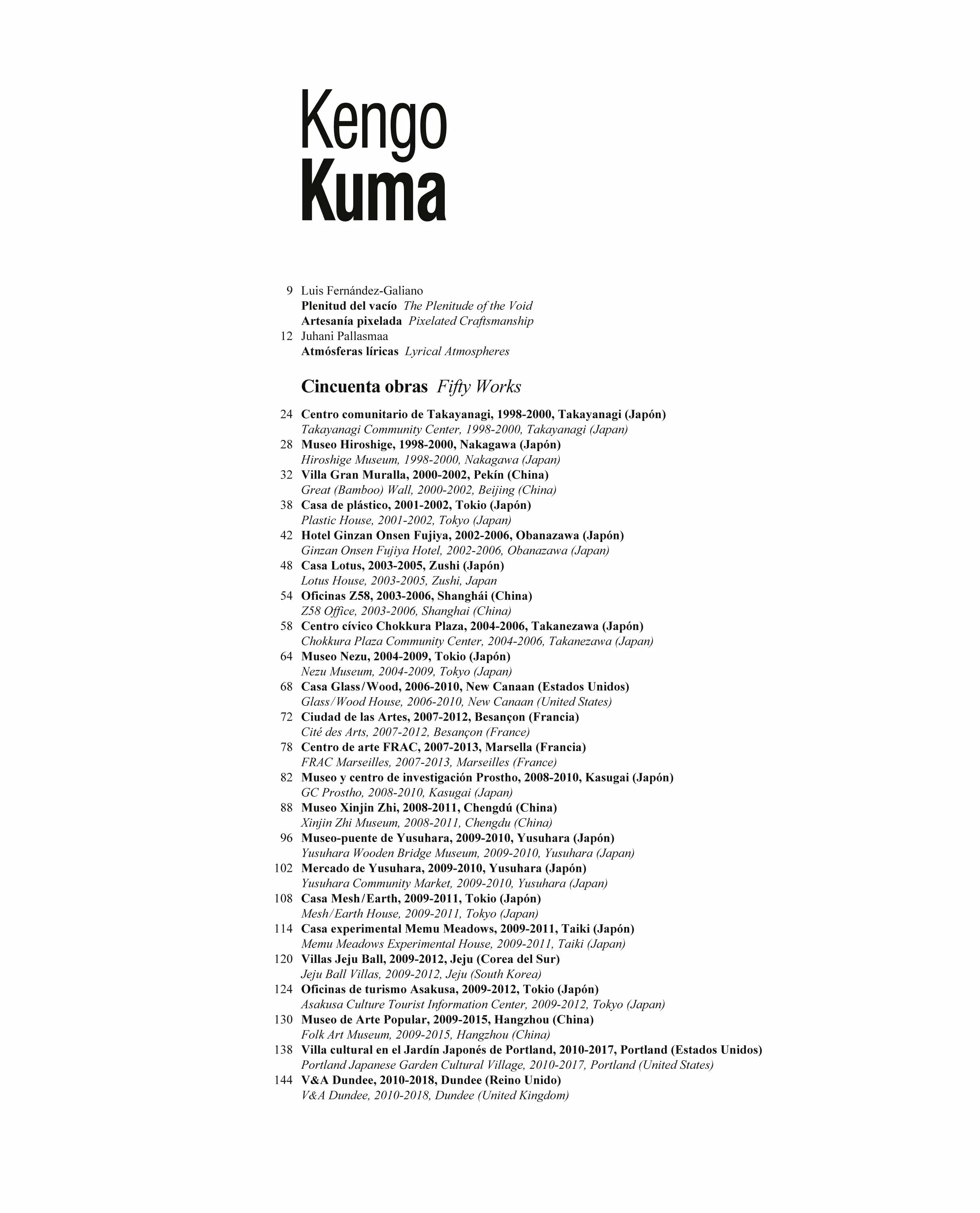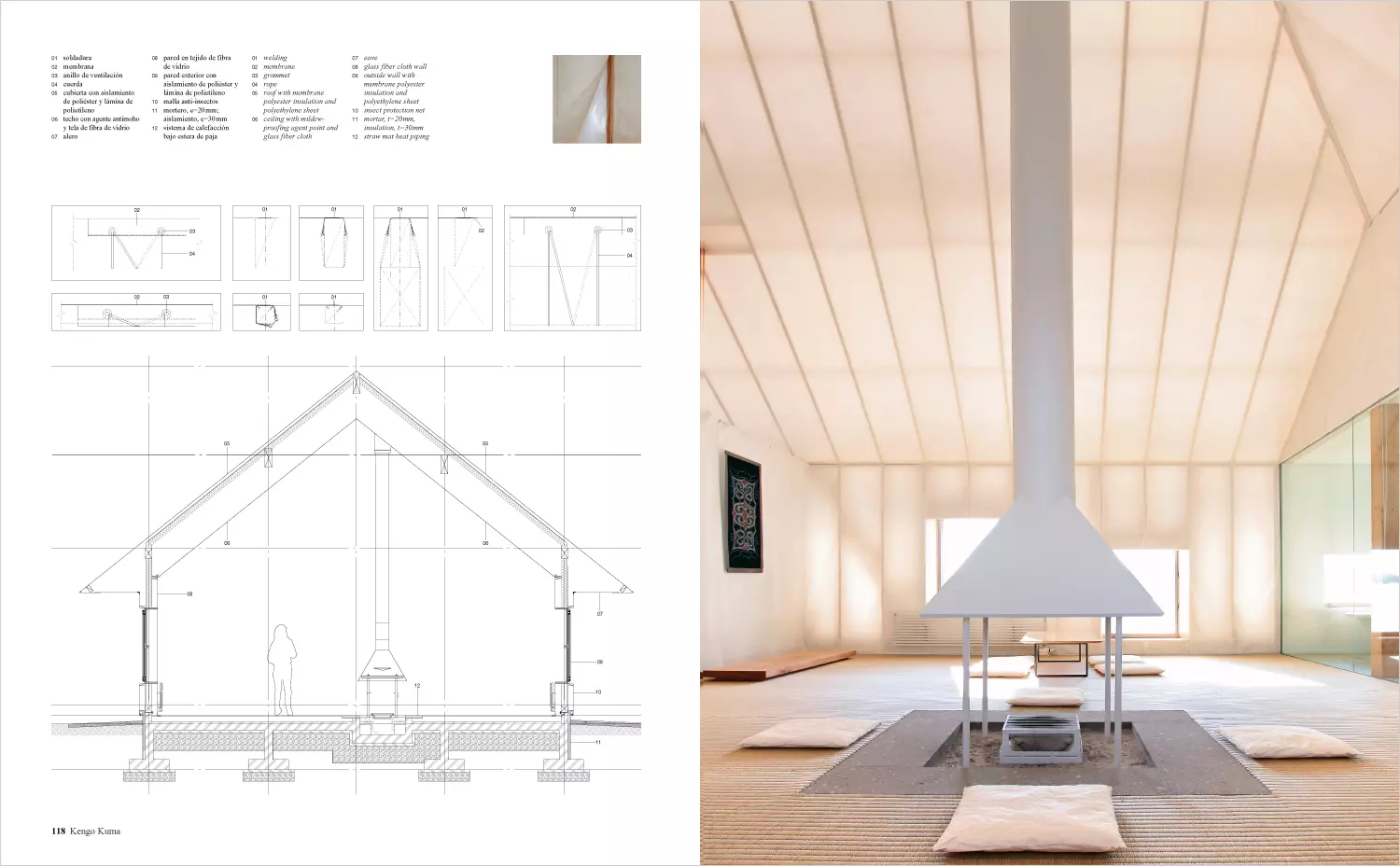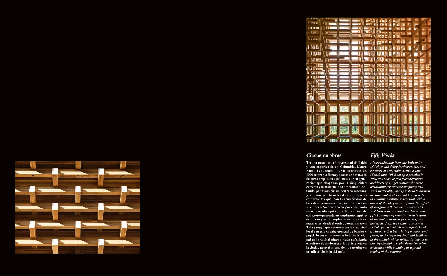 Setting himself apart from Japanese architects of his generation who are prone to pursue extreme simplicity and a bare materiality, Kengo Kuma prefers to pour his craftsman’s dexterity and his love of nature into comfortable spaces that, wth the sensitivity of ukiyo-e prints, seek to blend with the surroundings and recreate lyrical atmospheres. Arquitectura Viva now condenses a prolific creator’s corpus of buildings, minimal interventions, and projects in a large, 368-page bilingual (Spanish/English) hardbound volume that takes stock of the very wide register of strategies, scales, and materials of what is now a global enterprise, but maintains the simple refinement that is a trademark of the house. A presentation by Luis Fernández-Galiano and an in-depth essay by Juhani Pallasmaa complement Kuma’s own reflections, which close the publication.