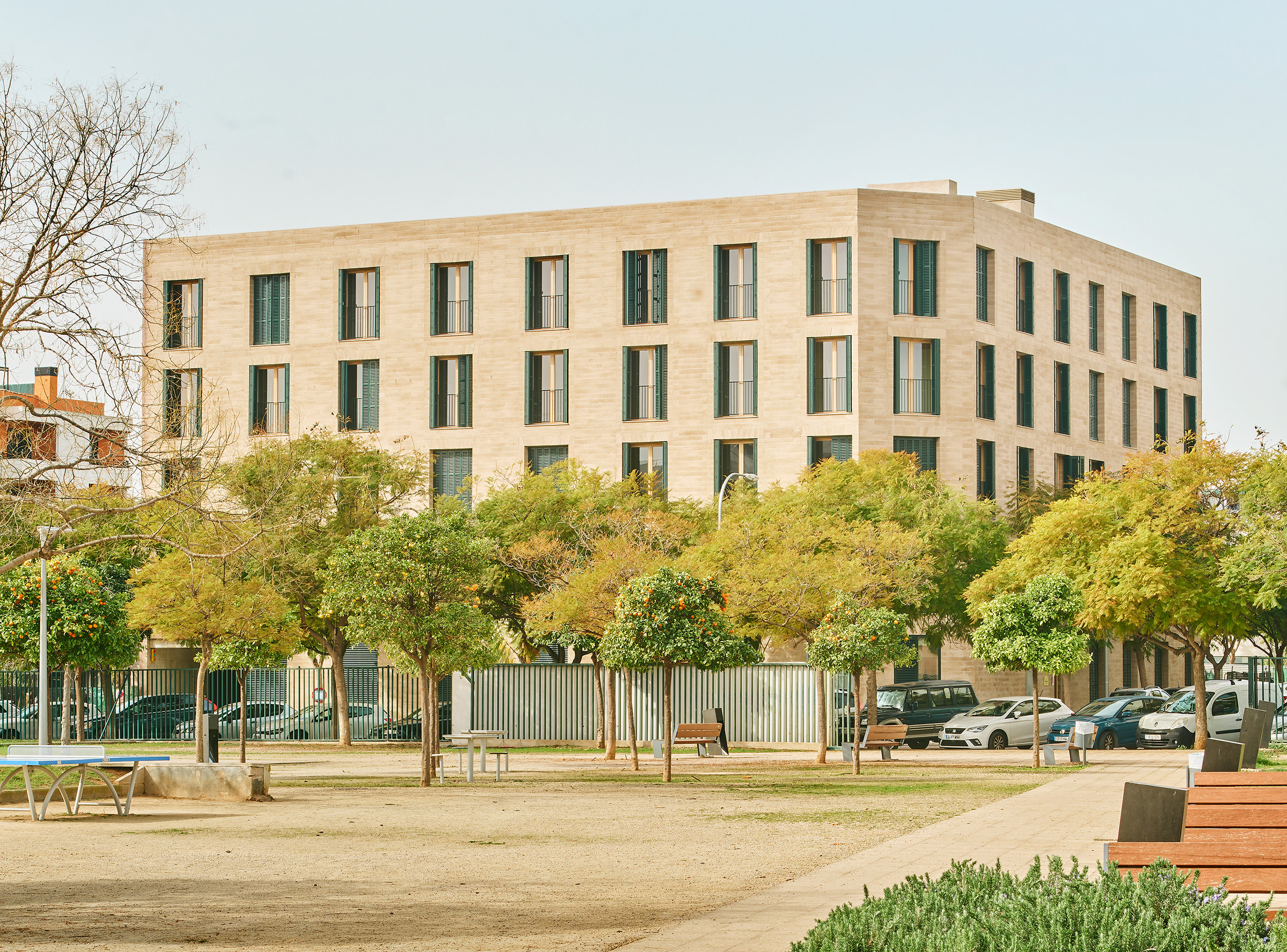 Promoted by the Balearic Housing Institute (IBAVI), this project addresses the need for affordable housing through a sustainable and contextualized approach. It consists of 38 apartments distributed across two buildings, located on the street Josep Togores in Palma de Mallorca, which use locally produced compressed earth blocks (CEB) and prefabricated slabs of timber, significantly reducing the project’s carbon footprint and reinforcing the island's architectural identity.