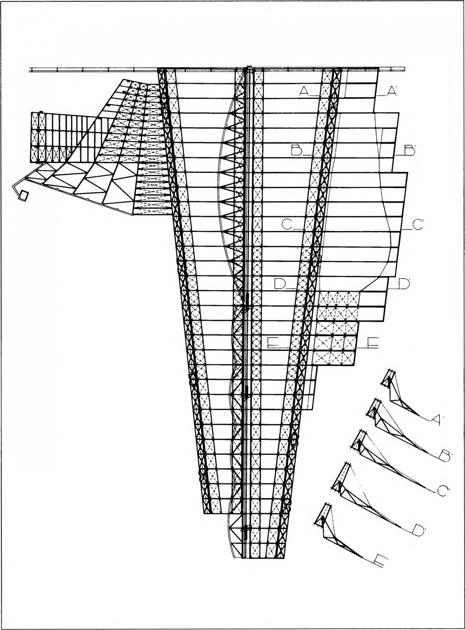 The trusses of the main roof which take off from the eurhythmic area (above), skip over the circulation core to stretch anew over the tiers of the competition arena (below).