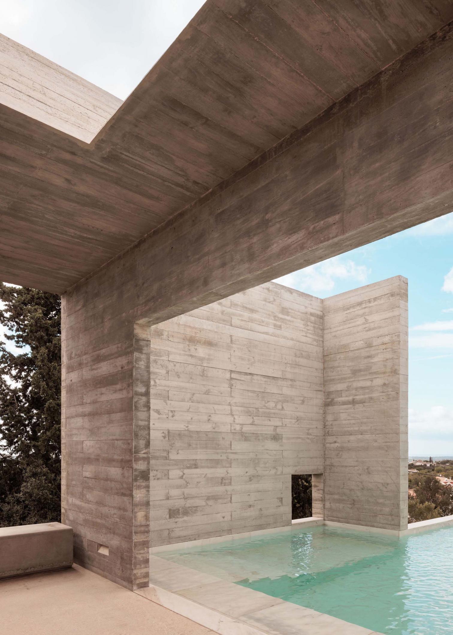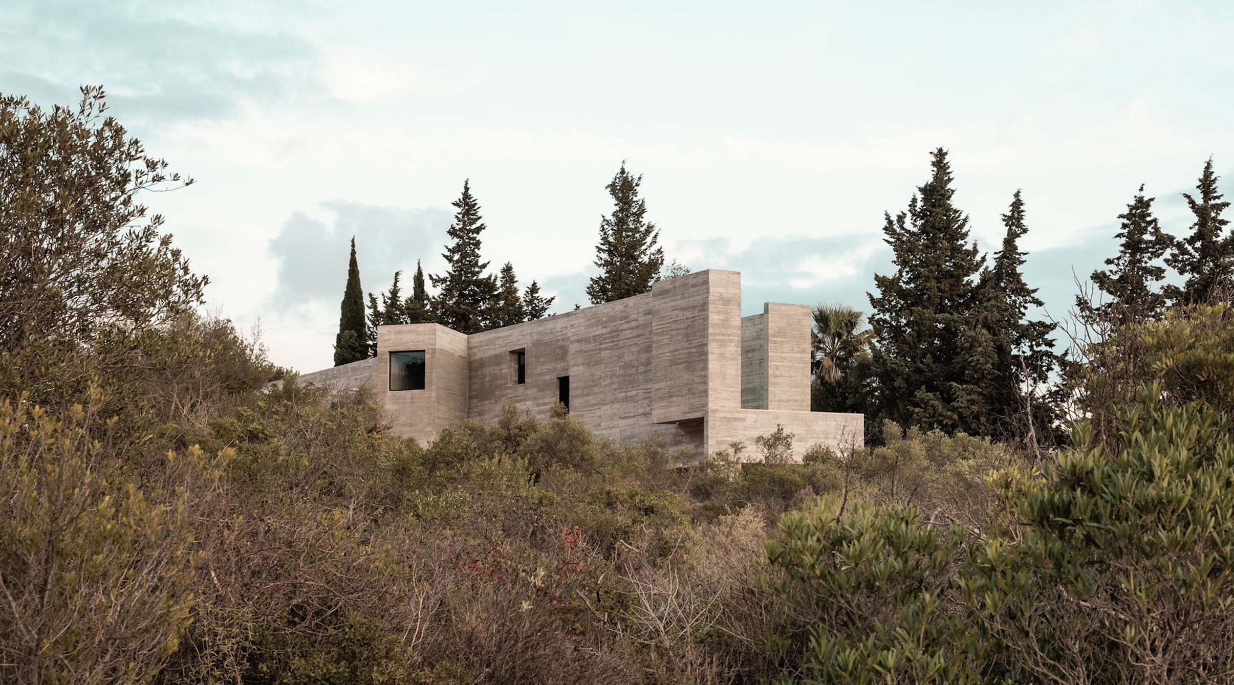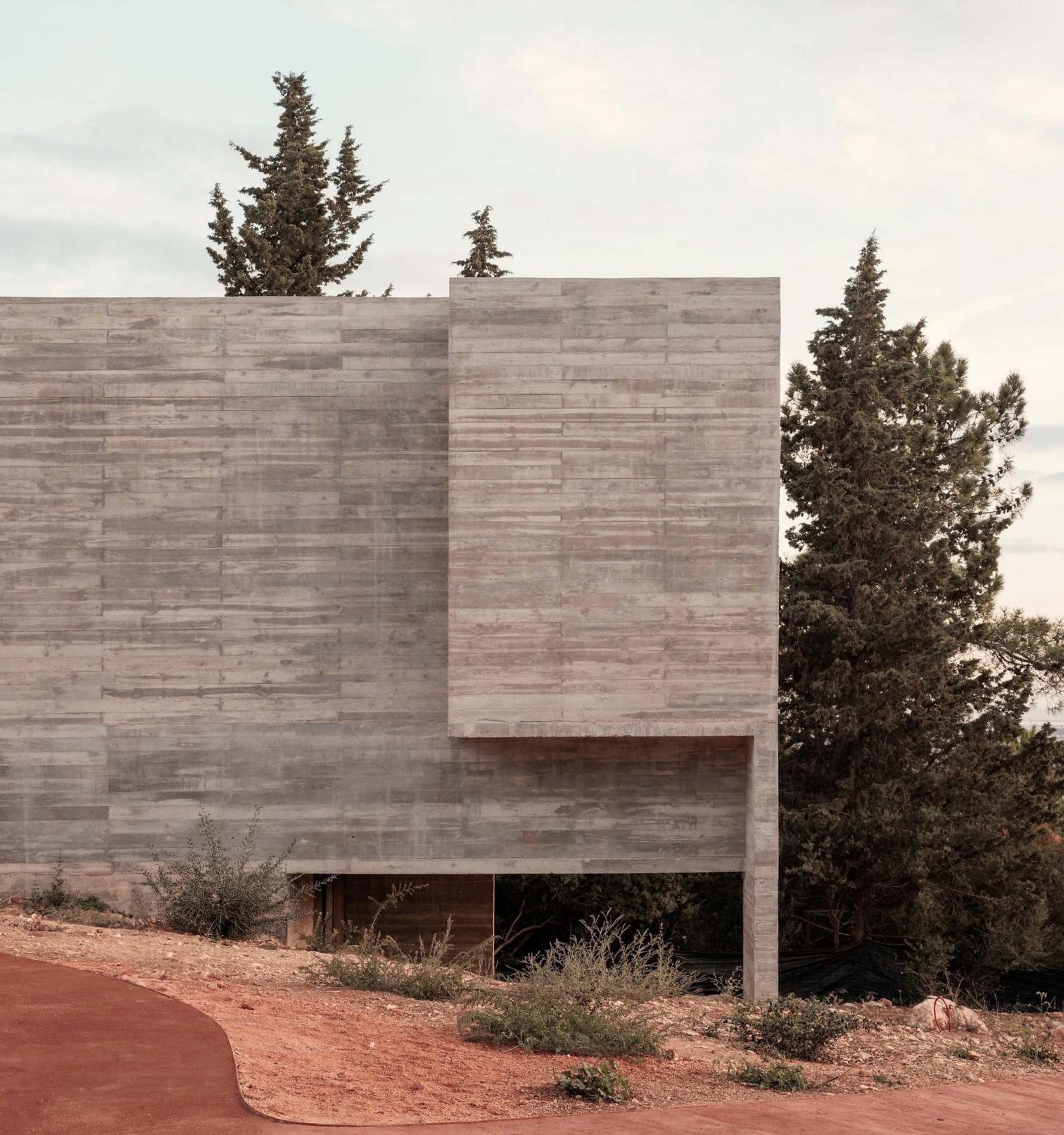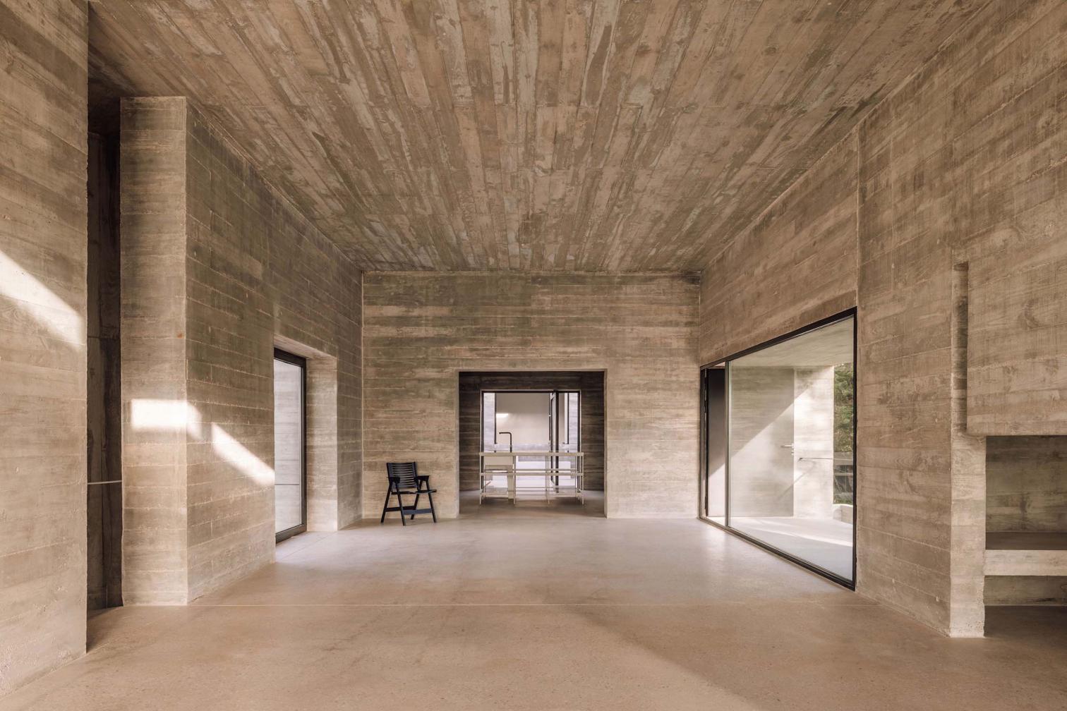 Built high on a hill near the town of Santa Bárbara de Nexe, this concrete house fuses with nature while evoking the image of an old ruin. To make the most of views, the main livable zones are placed in the upper level, a 385-square-meter space.