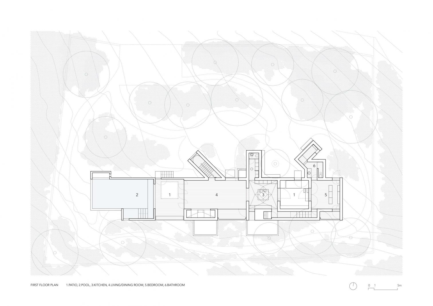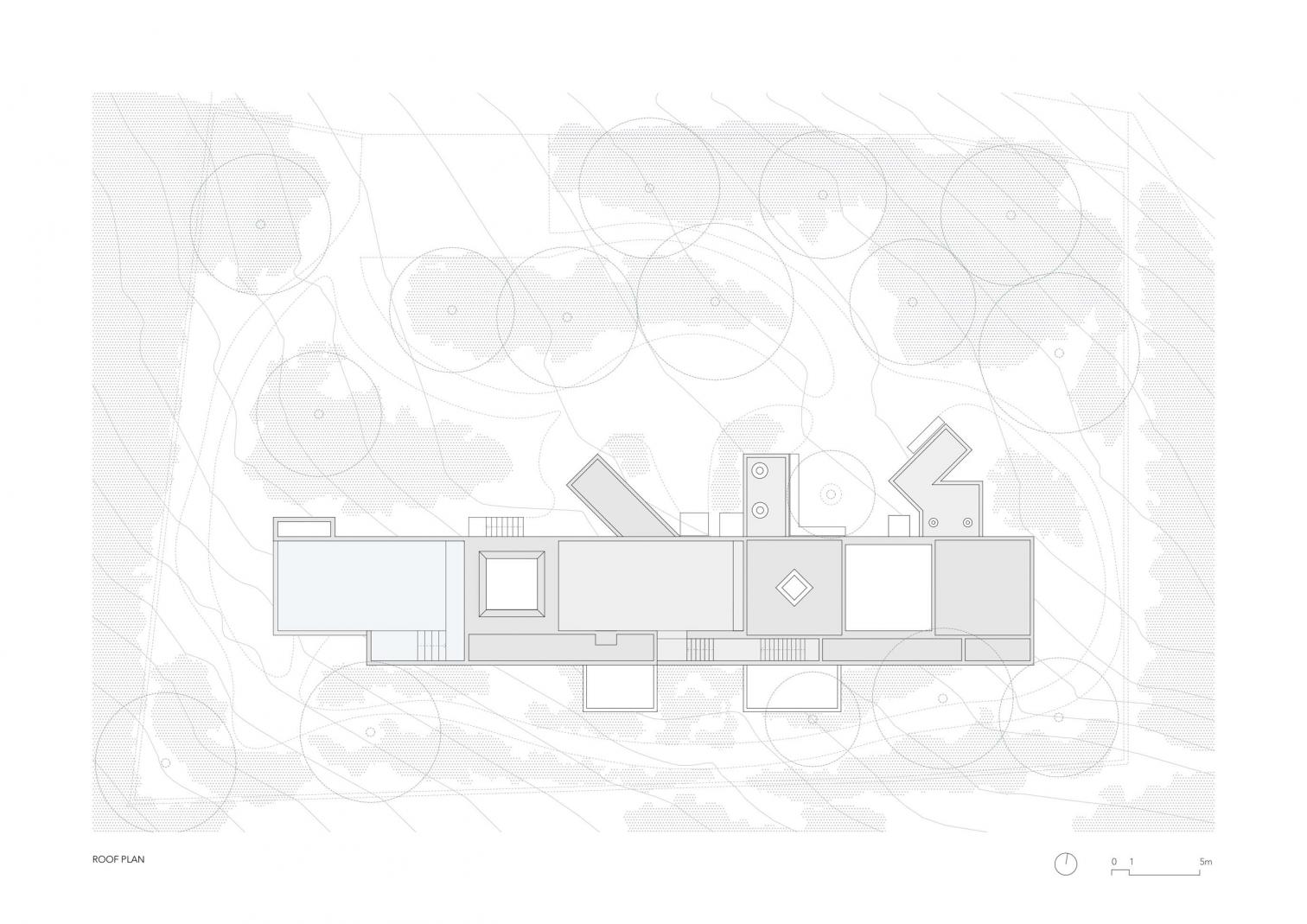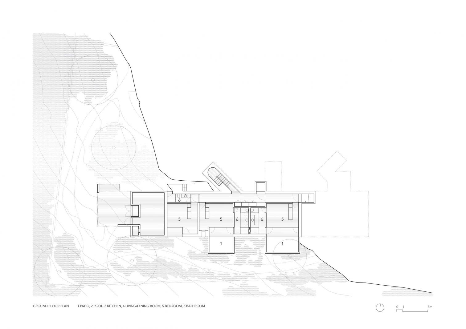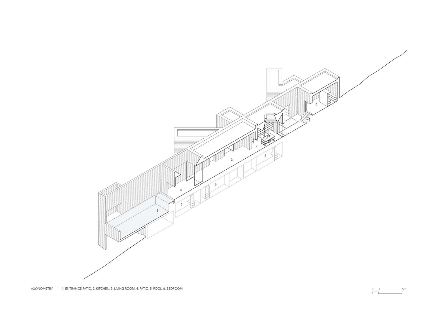 A sequence of interconnected spaces, arranged from east to west, distributes the main areas: the master bedroom, the entrance courtyard, the kitchen (with a skylight hanging, shaped like an inverted diamond), the living room with its built-in fireplace, the solarium, and the swimming pool flanked by view-framing high walls. There are three more bedrooms on the ground floor. Light and shade are carefully choreographed by means of patios and skylights throughout the house.