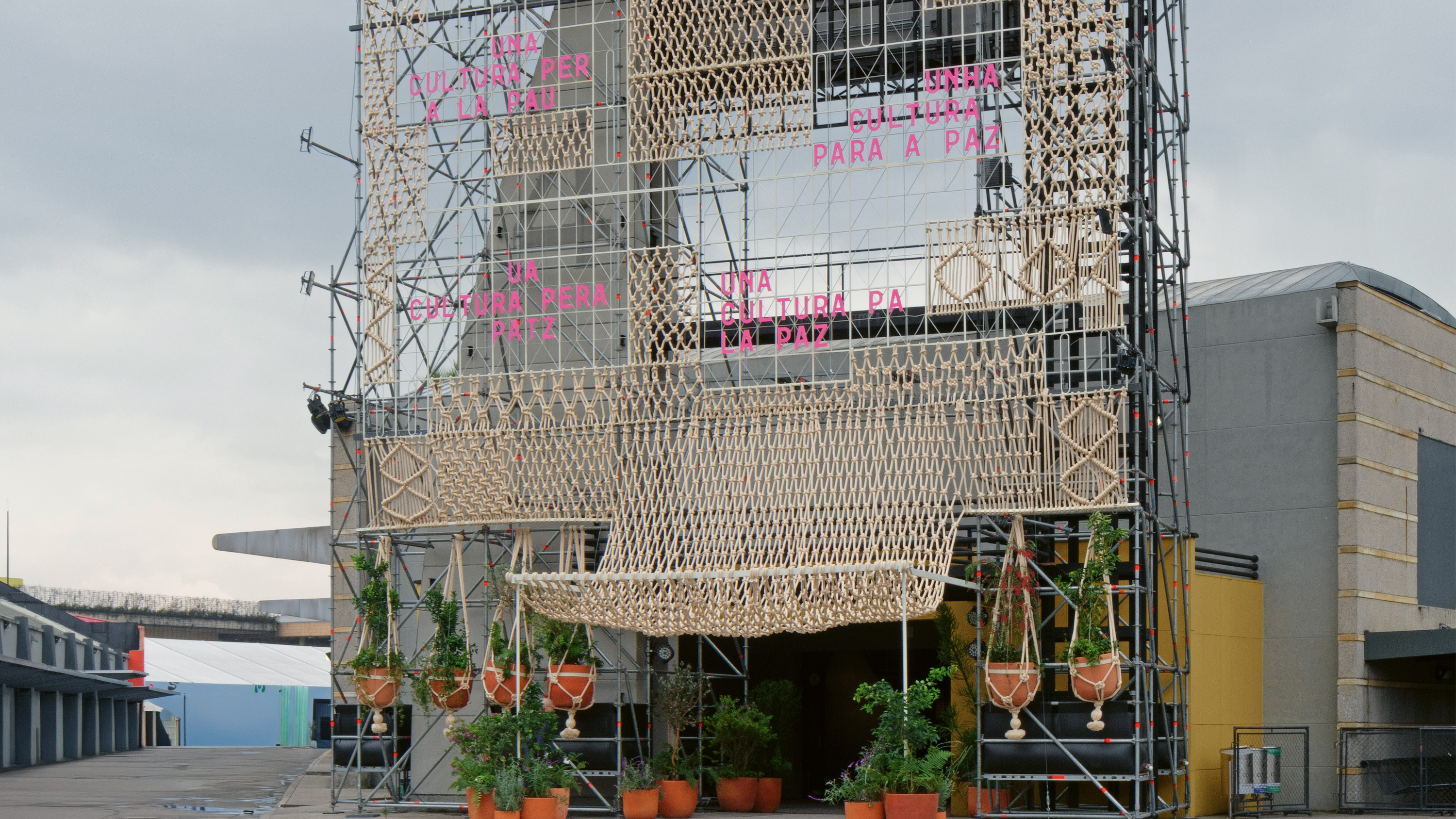 Preceded by an enormous macramé tapestry, the sequence of spaces is enriched by their materials: from the fishing nets serving as partitions to the auditorium’s curtains of wool felt and platforms of fique...[+]