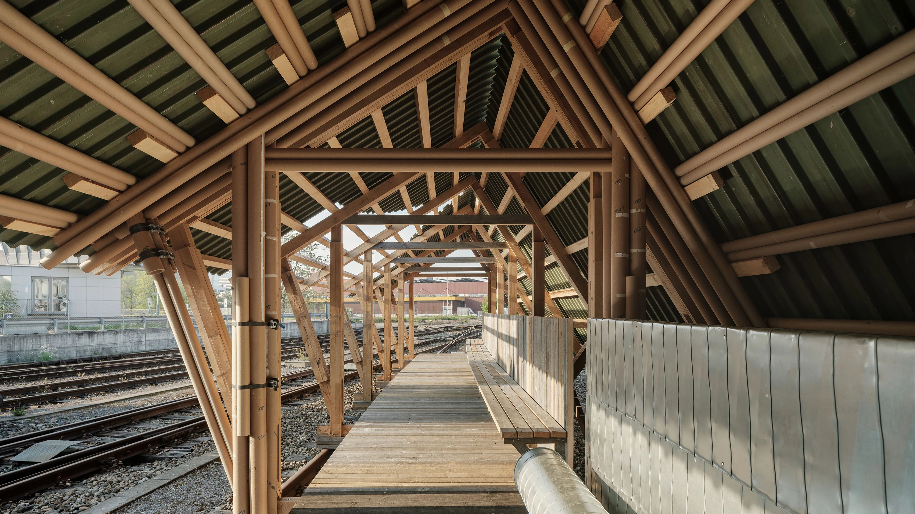 Conceived as an open linear structure, an urban corridor and veranda, the building is a circular architecture whose components and materials are all reused elements which have been organized in a catalog. The 50-meter-long pavilion is composed of porticoed modules combined in five different units, each with its own construction system. The pitched roof has cuts at preset intervals to let daylight in. Inside is a continuous bench, stretching the entire 50-meter length of the pavilion and following the curve of its structure.